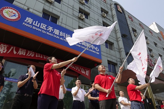 房山区司法局将主开放点设置在房山区矛盾纠纷多元调解中心,并在现场为成立的“送法服务先锋队”、“多元调解先锋队”、“社区服刑人员未成年子女帮扶志愿服务队”三支党员志愿服务(先锋)队伍授旗。三支队伍是房山区司法局严格落实司法部提出的“政治引领、党建先行”的工作要求,推进党建工作与司法行政业务工作有机融合的创新举措。市司法局副巡视员夏涛同志、区司法局局长陆大勇同志、驻区委政法委纪检监察组刘新宇同志为三支队伍授旗。