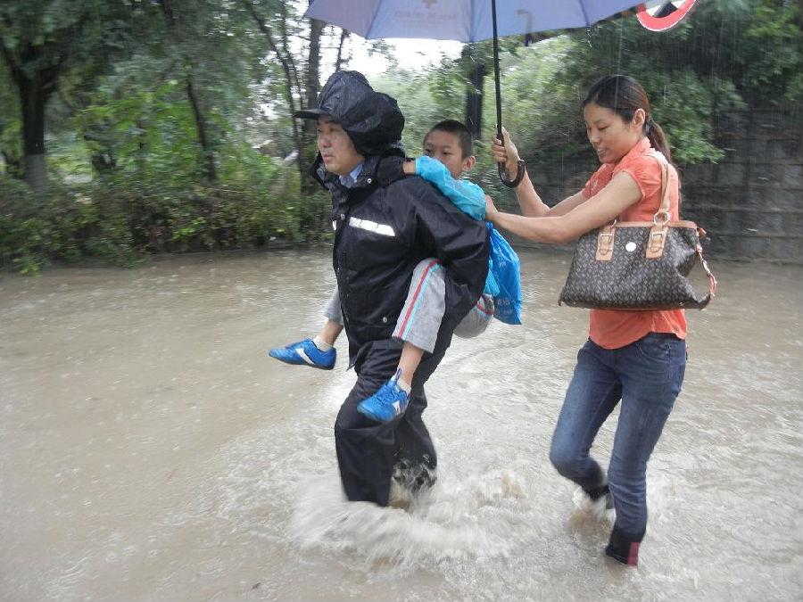 在西潞街道辖区,短时间内多个路段积水。根据雨情,西潞派出所组织民警上街巡逻处置险情。民警冒雨在积水路段拉起警戒带、劝返途经车辆。10时许,京石高速公路固村跨线桥下,积水最深处达到60厘米。一名妇女带着孩子途经此处,年幼的孩子无法通行。正在此处劝返群众的西潞派出所所长单伦二话不说,背起孩子涉水通过。(图①)