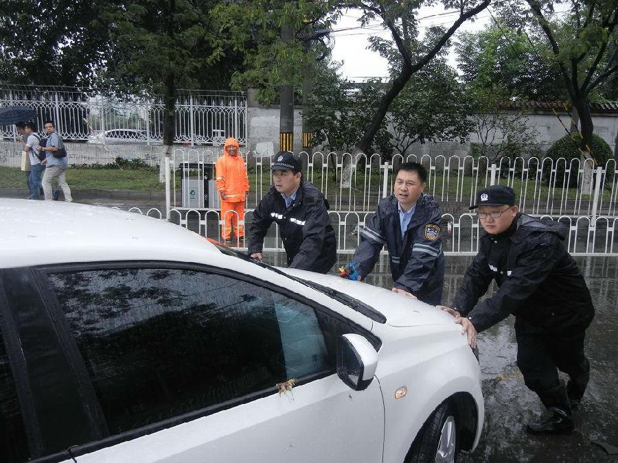 11时45分,北京师范大学附属中学门前,一辆轿车在水中熄火,引起道路交通堵塞。接到报警后,西潞派出所民警驱车前往现场指挥,合力帮助群众将车辆推出积水路段。